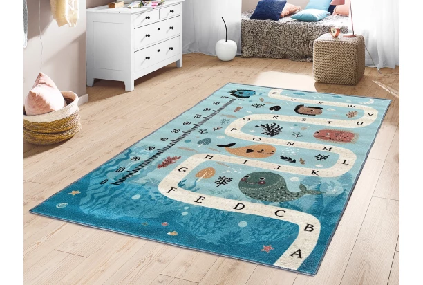 Detský modrý koberec o rozmere 80×150 cm s motívom morského sveta je nielen krásny, ale aj vzdelávací. Vaše dieťa sa môže hravou formou naučiť abecedu aj čísla. Veselé rybičky so všetkým radi pomôžu.