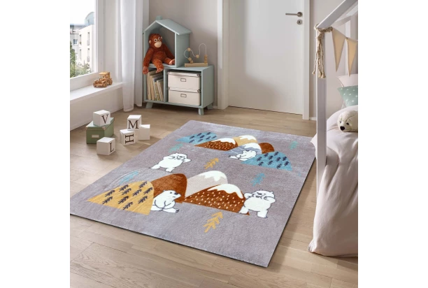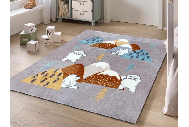 Očarujúci koberec s roztomilými bielymi medvedíkmi v horách zaistí dobrú náladu v každej detskej izbičke. Rozmer 120×170 cm.