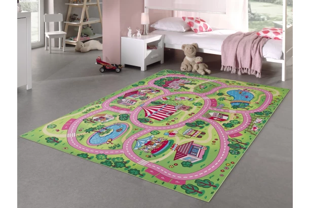 Detský koberec na hranie o rozmere 140×200 cm zaujme nápaditým a kúzelným dizajnom. Obľúbia si ho hlavne dievčatá, pretože koberec je ladený do ružovej farby. Tento detský koberec je ideálny pre všetkých fanúšikov áut a poskytuje fantastický hrací povrch, na ktorom deti môžu so svojimi autíčkami preskúmavať ulice vedúce medzi hradom, cirkusovým stanom, obchodmi a kolotočom. Vaše deti sa zabavia na dlhé hodiny, a preto je tento koberec skvelý doplnok do detskej izby.