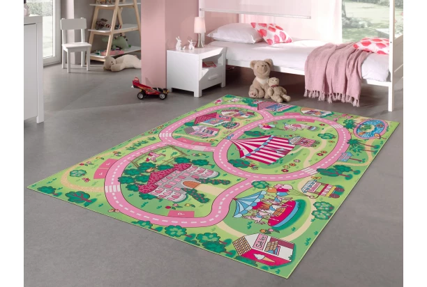 Detský koberec na hranie o rozmere 100×150 cm zaujme nápaditým a kúzelným dizajnom. Obľúbia si ho hlavne dievčatá, pretože koberec je ladený do ružovej farby. Tento detský koberec je ideálny pre všetkých fanúšikov áut a poskytuje fantastický hrací povrch, na ktorom deti môžu so svojimi autíčkami preskúmavať ulice vedúce medzi hradom, cirkusovým stanom, obchodmi a kolotočom. Vaše deti sa zabavia na dlhé hodiny, a preto je tento koberec skvelý doplnok do detskej izby.