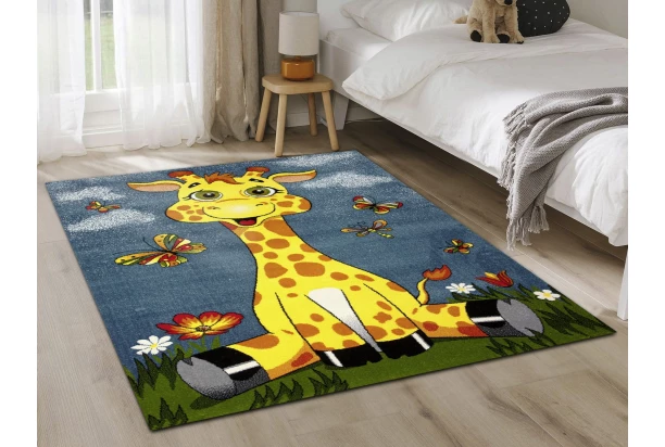 Tento mäkký koberec s veselou žirafou a motýľmi rozjasní každú detskú izbičku. Živé farby a roztomilý dizajn motivujú deti k hre a fantázii. Rozmer 120×170 cm.