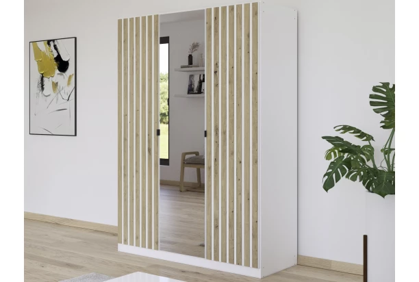 Štýlová šatníková skriňa o šírke 136 cm je vyrobená v kombinácii biela / dub artisan a doplnená dekoračnými lamelami. Táto skriňa má 1 zrkadlo a 3 otočné dvere, za ktorými nájdete kovové šatníkové tyče a police. Priestory vo vnútri skrine môžete navyše ľubovoľne doplniť ďalšími policami a prispôsobiť si tak vnútorný priestor na ukladanie podľa vašich potrieb. Pri tejto modernej skrine oceníte nielen praktickosť, ale aj použitie kvalitných materiálov a dobré spracovanie.