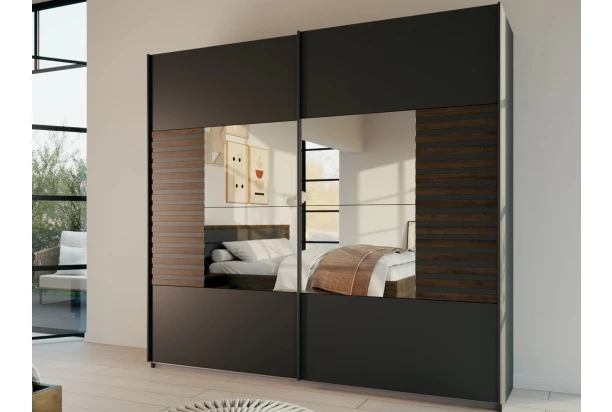 Šatníková skriňa so zrkadlom z kolekcie Barea – nábytok do spálne v modernom lamelovom dizajne ponúka praktickosť aj kvalitné spracovanie. Tento trendový nábytok v kombinácii tmavo šedých plôch s dubovým drevodekorom vytvára štýlové akcenty. Posuvné dvere skrine umožňujú ľahký prístup do vnútorného priestoru a dopĺňajú ich zrkadlá, ktoré opticky zväčšia priestor vo vnútri miestnosti. Skriňa so šírkou 226 cm má dva vnútorné bloky, ktoré môžete ľubovoľne doplniť ďalšími policami. Vonkajšiu konštrukciu skrine je možné navyše doplniť okrasným paspartovým rámom.