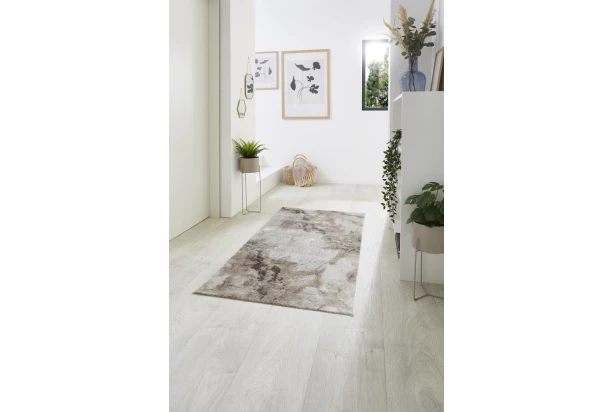 Krémovo-hnedý koberec s rozmermi 80×150 cm s abstraktným vzorom evokujúcim mramorovú textúru je elegantným a štýlovým doplnkom do obývacej izby, spálne, predsiene alebo detskej izby. Vďaka svojmu dizajnu sa skvele hodí k modernému aj klasickému nábytku.