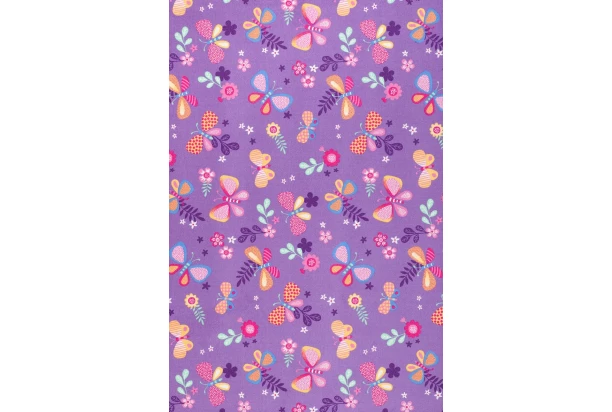 Krásny fialový koberec so vzorom farebných motýľov a kvetov sa hodí do detskej izby. Jeho veselý design dodá miestnosti hravú a útulnú atmosféru. Rozmer 100×150 cm.