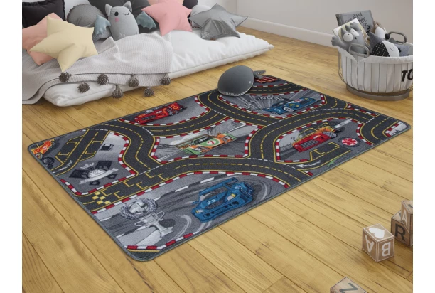 Šedý detský koberec na hranie o rozmere 100×150 cm zaujme svojim nápaditým dizajnom, ktorý je ideálny pre všetkých fanúšikov áut a poskytuje fantastický hrací povrch, na ktorom deti môžu so svojimi autíčkami pretekať po dráhe. Vaše deti sa zabavia na dlhé hodiny, a preto je to skvelý doplnok do detskej izby.