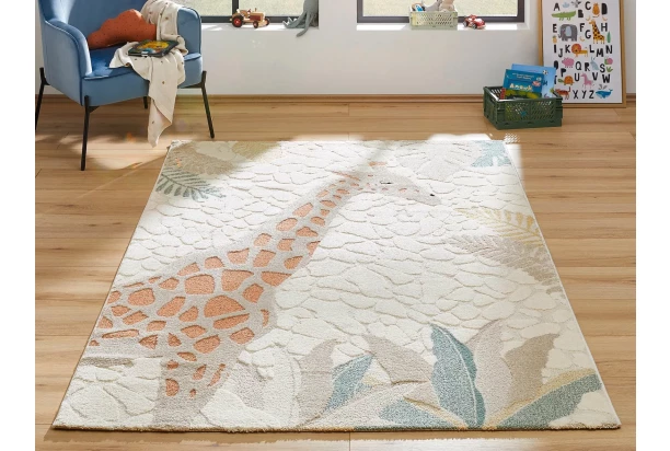 Koberec s motívom žirafy prinesie do detskej izby radosť aj pohodlie. Mäkký povrch zaistí príjemné hranie na podlahe, zatiaľ čo veselý dizajn v jemných pastelových farbách krásne oživí interiér a podporí fantáziu detí. Vďaka neutrálnemu farebnému ladeniu sa hodí ako do chlapčenskej, tak aj dievčenskej izbičky.