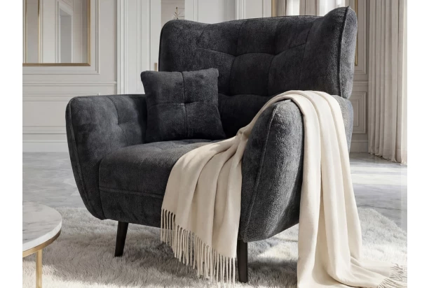 Štýlové kreslo vyniká elegantným dizajnom a vysokým komfortom, ktorý oceníte pri každodennom odpočinku. Bohaté vypolstrovanie spolu s vysokým operadlom poskytuje skvelú oporu pre chrbát aj hlavu, takže si môžete dopriať maximálne pohodlie pri relaxácii, sledovaní televízie alebo posedení s rodinou. Na prvý pohľad zaujme svojimi jemne zaoblenými tvarmi a výrazným prešívaním, ktoré dodáva kreslu luxusný a štýlový vzhľad. Vďaka tomu sa stane výrazným dizajnovým prvkom každej obývačky a ľahko doplní moderný aj elegantne ladený interiér. Stabilitu a zároveň vzdušný vzhľad zaisťuje čierna podnož z masívneho dreva, ktorá kreslu dodáva pevnosť a prirodzený charakter. Toto kreslo je očalúnené príjemne mäkkou žinilkovou látkou v antracitovo šedej farbe, ktorá je nielen elegantná, ale aj príjemná na dotyk.