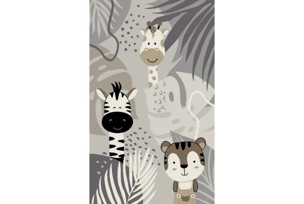 Roztomilý detský koberec s motívom veselých zvieratiek z džungle na šedom podklade sa ľahko začlení do rôznych štýlov detských izbičiek. Dizajn je ideálny na vytvorenie hravého a zároveň upokojujúceho prostredia. Rozmer 120×170 cm.