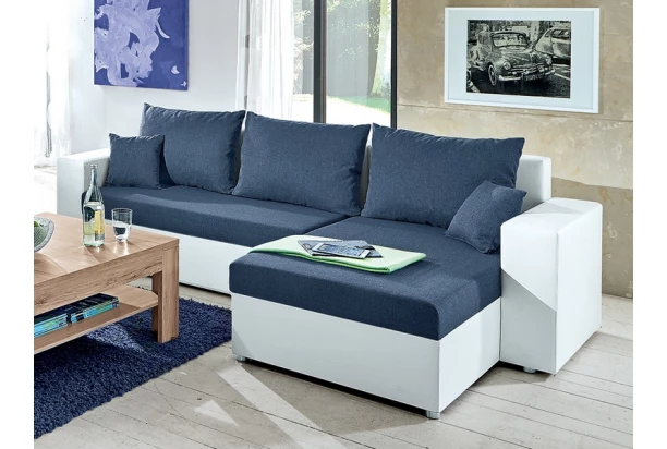 Rohová sedacia súprava v kompaktných rozmeroch, možné univerzálne zostaviť ako pravý/ľavý roh. Ľahko ju tak umiestnite do akejkoľvek miestnosti. Potiahnutá kombináciou bielej ekokože a tmavo modrej látky.