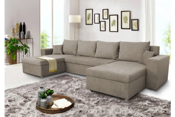 Sedacia súprava v tvare U je obľúbená pre svoju praktickosť, priestrannosť a priaznivú cenu. Ponúka mäkké oporné vankúše, úložný priestor aj funkciu rozkladu na lôžko. Očalúnená tkaninou vo farbe svetlo hnedá.