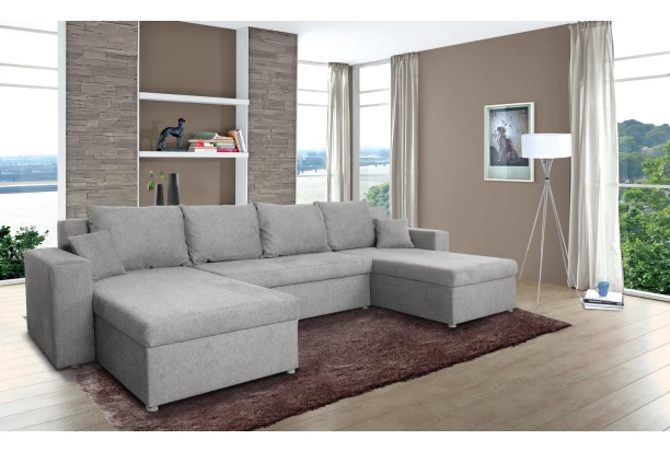 Sedacia súprava v tvare U je obľúbená pre svoju praktickosť, priestrannosť a priaznivú cenu. Ponúka mäkké oporné vankúše, úložný priestor aj funkciu rozkladu na lôžko. Očalúnená tkaninou vo farbe svetlo šedá.