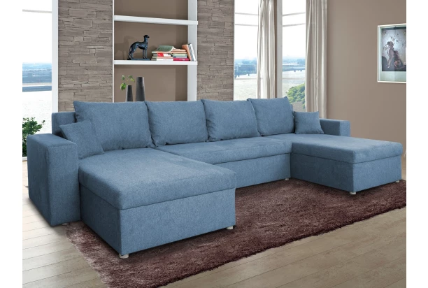 Sedacia súprava v tvare U je obľúbená pre svoju praktickosť, priestrannosť a priaznivú cenu. Ponúka mäkké oporné vankúše, úložný priestor aj funkciu rozkladu na lôžko. Očalúnená tkaninou vo farbe jeansovo modrá.