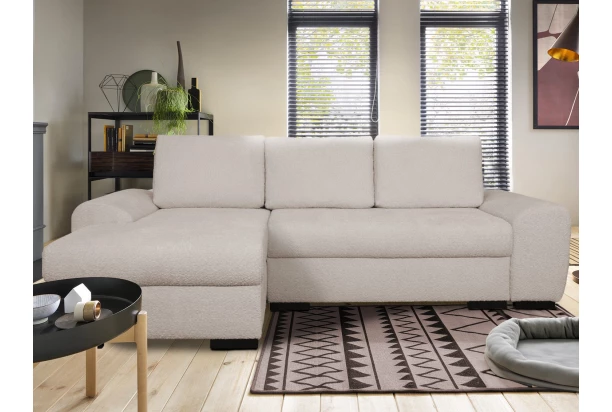 Rohová sedačka so zaoblenými tvarmi, veľkými opornými vankúšmi, úložným miestom a rozkladom. Sedacia súprava môže byť univerzálne zmontovaná ako pravý alebo ľavý roh. Očalúnená mäkučkou látkou s dlhším štruktúrovaným vlasom vo farbe svetlo béžová.