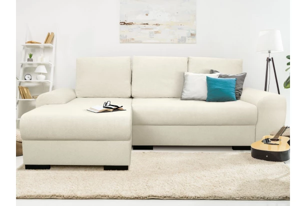 Rohová sedačka so zaoblenými tvarmi, veľkými opornými vankúšmi, úložným miestom a rozkladom. Sedacia súprava môže byť univerzálne zmontovaná ako pravý alebo ľavý roh. Očalúnená jemne štruktúrovanou látkou vo farbe béžová.