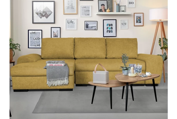 Žltá rohová sedačka so zaoblenými tvarmi, veľkými opornými vankúšmi, úložným miestom a rozkladom. Sedacia súprava môže byť univerzálne zmontovaná ako pravý alebo ľavý roh. Očalúnená príjemne mäkkou látkou v horčicovo žltom odtieni.