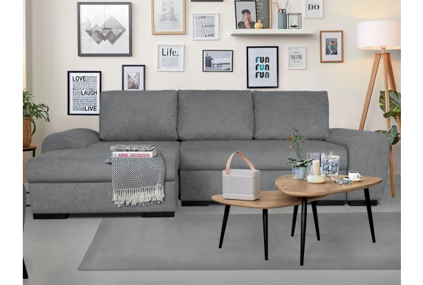 Šedá rohová sedačka so zaoblenými tvarmi, veľkými opornými vankúšmi, úložným miestom a rozkladom. Sedacia súprava môže byť univerzálne zmontovaná ako pravý alebo ľavý roh. Očalúnená príjemne mäkkou látkou v stredne šedom odtieni.