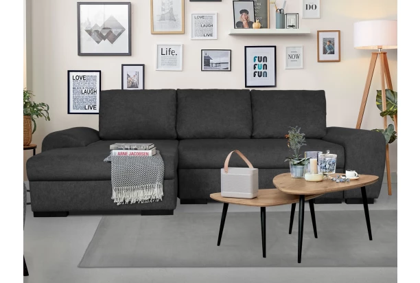 Čierna rohová sedačka so zaoblenými tvarmi, veľkými opornými vankúšmi, úložným miestom a rozkladom. Sedacia súprava môže byť univerzálne zmontovaná ako pravý alebo ľavý roh. Očalúnená príjemne mäkkou látkou v čiernej farbe.