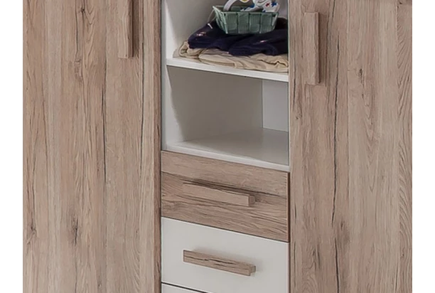 Praktická komoda so širokým prebaľovacím pultom z programu Cariba v kombinácii dekoru dub san remo a bielej farby.