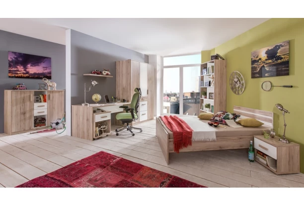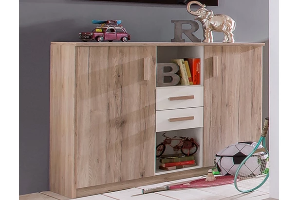 Široká komoda z programu Cariba v kombinácii dekoru dub san remo a bielej farby. Svojim univerzálnym štýlom je vhodná pre vybavenie spálne, šatne i detskej izby.