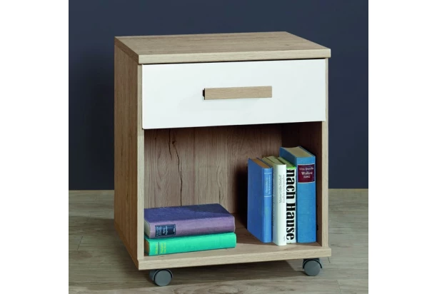 Úložný kontajner na kolieskach z programu Cariba v kombinácii dekoru dub san remo/biely. Vhodný pre vybavenie akejkoľvek pracovne i detskej izby.