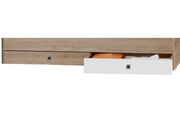 Sada úložných zásuviek pod posteľ z programu Cariba v kombinácii dekoru dub san remo a bielej farby. Maximálne univerzálna konštrukcia na kolieskach – stačí zasunúť pod akoukoľvek posteľ.