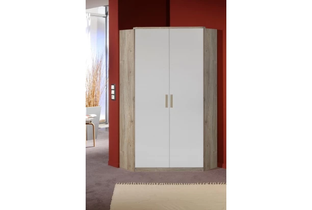 Rohová šatníková skriňa z programu Cariba v kombinácii dekor dub san remo a bielej farby. Svojim univerzálnym štýlom je vhodná pre vybavenie spálne, šatne i detskej izby.