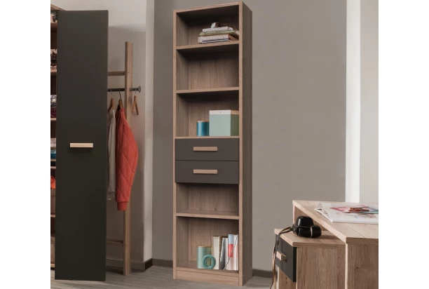 Vysoký regál so zásuvkami z programu Cariba v kombinácii dekoru dub san remo a grafitovej farby. Svojím univerzálnym štýlom je vhodný pre vybavenie obývačky, šatne aj detskej izby.