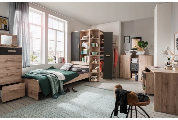 Priestranná rohová šatníková skriňa z programu Cariba v kombinácii dekoru dub san remo a grafitovej farby. Táto skriňa je zároveň šatňa – univerzálny, moderný a hlavne praktický nábytok pre zariadenie izby pre deti, teenagerov aj spálne pre dospelých. Vonkajšia strana skrine obsahuje otvorené odkladacie priehradky a otočné dvere s vnútorným úložným priestorom. Za skladacími dverami nájdete vnútorný priechodný priestor so šatňou, súčasťou ktorej sú úložné regály, šatníková tyč a závesné háčiky na oblečenie. Vďaka univerzálnosti montáže je možné šatňu umiestniť do akéhokoľvek rohu miestnosti – do pravého aj ľavého rohu. Celý rohový šatník je možné navyše ľubovoľne doplniť o horný krycí strop s osvetlením a získať tak úplne uzavretý priestor.