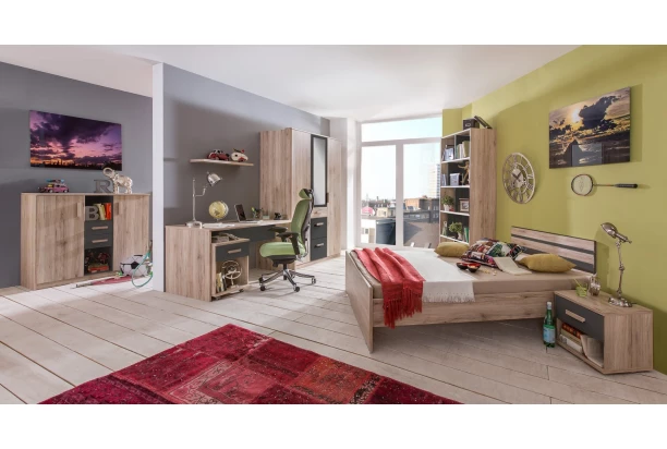 Posteľ s rozmerom lôžka 140×200 cm z programu Cariba v kombinácii dekoru dub san remo a grafitovej farby. Vhodný pre vybavenie akejkoľvek spálne aj detskej izby.
