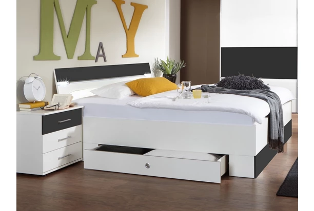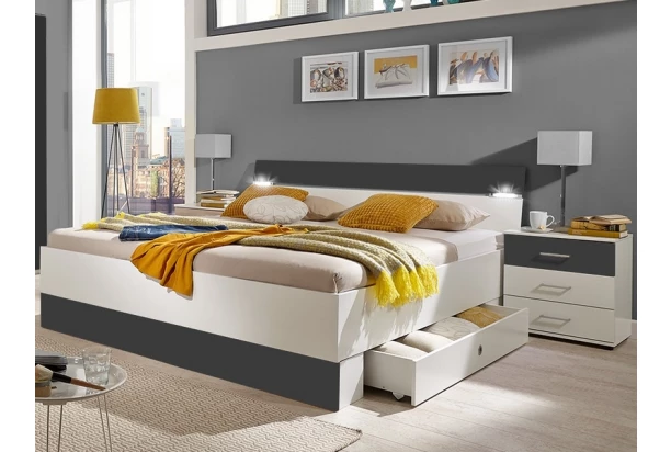 Posteľ s nočnými stolíkmi si obľúbite predovšetkým pre jej praktickosť: zabudované osvetlenie využijete pri večernom čítaní a úložné zásuvky pre uschovanie posteľnej bielizne. V kombinácii biela/grafit.
