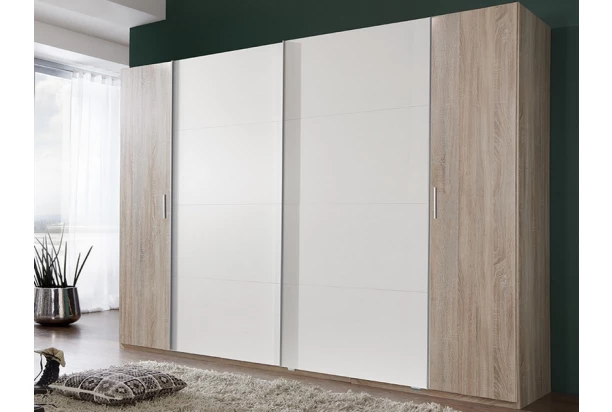 Moderná šatníková skriňa Lotto zaujme kombináciou posuvných a otočných dverí. Oceníte prakticky riešený vnútorný priestor, kde nájdete policový systém aj závesné tyče. V kombinácii dub sonoma/biela.