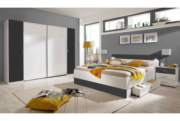 Moderná šatníková skriňa Lotto zaujme kombináciou posuvných a otočných dverí. Oceníte prakticky riešený vnútorný priestor, kde nájdete policový systém aj závesné tyče. V kombinácii biela/grafitová.