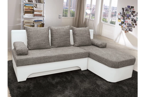 Malá rohová sedačka aj do tých najmenších miestností. Môžete využiť tiež úložný priestor a rozklad na príležitostné lôžko. V kombinácii biela ekokoža/melírovaná tkanina.