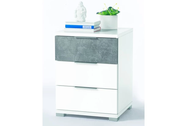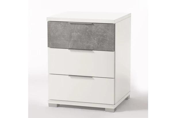 Moderný nočný stolík s komfortne vyššou konštrukciou sa ideálne hodí k vyššiemu lôžku. Vyrobený v kombinácii biela / imitácia sivý betón.