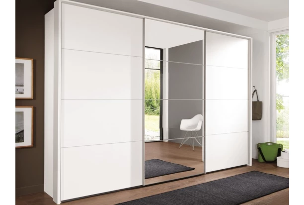 Veľká šatníková skriňa s 3 posuvnými dverami a s celkovou šírkou 270 cm. Vyrobená v celobielom prevedení so stredovým zrkadlom. Ponúka dostatok úložných priestorov pre početné ošatenie, navyše možno doplniť o ďalšie vnútorné police.