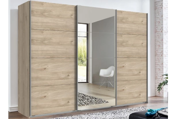 Veľká šatníková skriňa s 3 posuvnými dverami a s celkovou šírkou 270 cm. Vyrobená v dekore dub hickory so stredovým zrkadlom. Ponúka dostatok úložných priestorov pre početné ošatenie, navyše možno doplniť o ďalšie vnútorné police.
