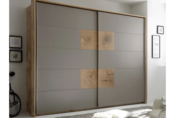 Šatníková skriňa s posuvnými dverami z dizajnovej kolekcie Capri. Optika rozpraskaného dubového dreva zaujme na pohľad a pôsobí ako prírodný dekoratívny prvok. Nábytok s hnedými prvkami drevodekoru a s výraznými hrčami, tak vytvorí dokonalé prostredie pre útulne zariadený domov.