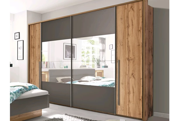 Veľmi priestranná šatníková skriňa so šírkou 312 cm s kombináciou posuvných a otočných dverí. Hnedé akcenty dubového drevodekoru, dopĺňajú šedé plochy a zrkadlá – skriňa, tak vytvorí dokonalé prostredie pre útulne zariadený domov. Oceníte aj vnútorné police, vďaka ktorým budete mať oblečenie prehľadne uložené.