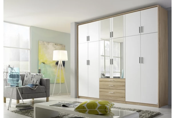Extra veľká šatníková skriňa so šírkou 271 cm a navyše zväčšená výška s prehľadným usporiadaním vnútorných úložných priestorov. Obsahuje celkom 12 dverí, vnútorné police, zrkadlá i 3 zásuvky. V kombinácii dub sonoma / biela.