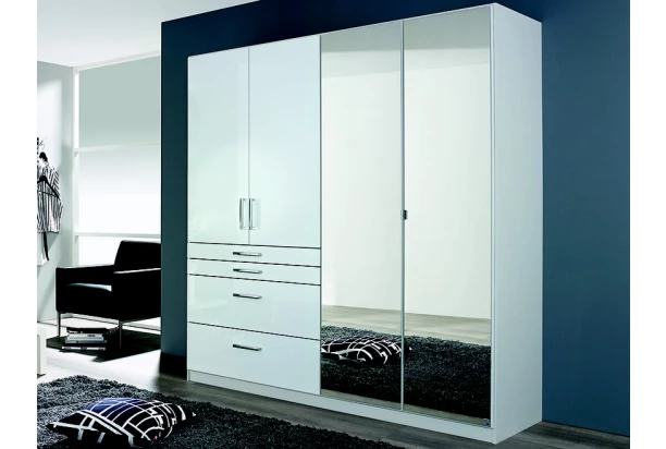 Moderná šatníková skriňa so šírkou 181 cm s veľkými zrkadlami a bielym vysokolesklím povrchom pôsobí luxusne v každom priestore spálne alebo šatne.