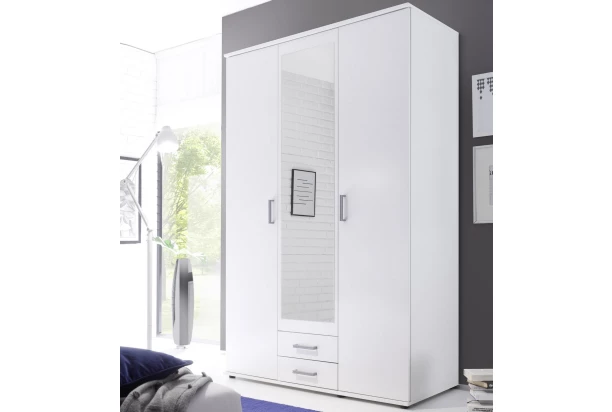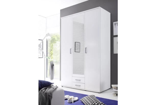 Skriňa v bielej farbe je univerzálne využiteľná v každej miestnosti, kde potrebujete doplniť úložné priestory. Táto biela skriňa obsahuje troje dvere, zrkadlo a dve zásuvky uprostred.
