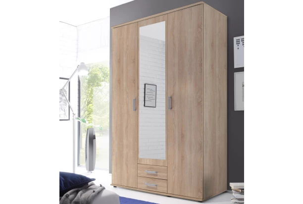 Skriňa v dekore dub sonoma je univerzálne využiteľná v každej miestnosti, kde potrebujete doplniť úložné priestory. Táto skriňa obsahuje tri dvere, zrkadlo a dve zásuvky uprostred.