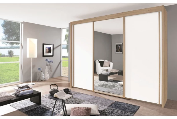 Priestranná a veľmi obľúbená šatníková skriňa s kvalitnou konštrukciou o šírke 250 cm. V kombinácii dub sonoma s bielymi plochami. Vnútorné priestory prístupné cez 3 komfortné posuvné dvere. Veľké zrkadlo uprostred opticky zväčšuje okolitý priestor v miestnosti.