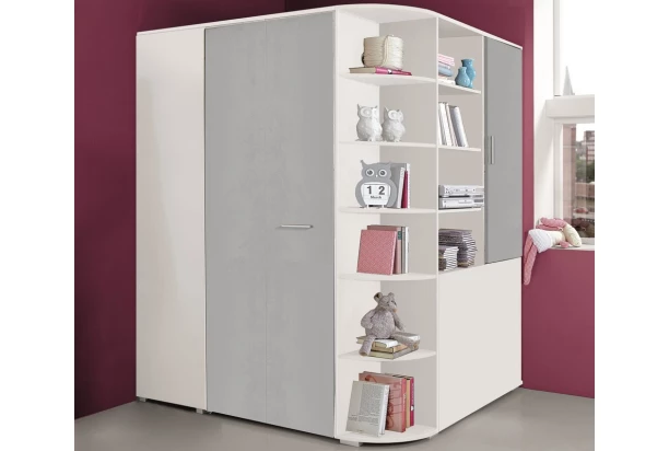 Priestranná rohová šatníková skriňa z programu Joker je zároveň šatňa – univerzálny, moderný a hlavne praktický nábytok pre zariadenie izby pre deti, teenagerov i spálňa pre dospelých. V kombinácii biela/imitácia sivý betón. Vonkajšia strana skrine, obsahuje otvorené odkladacie priehradky a otočné dvere s vnútorným úložným priestorom. Za skladacími dverami, nájdete vnútorný priechodný priestor so šatňou, ktorej súčasťou sú úložné regály, šatníková tyč a závesné háčiky na oblečenie. Vďaka univerzálnosti montáže, možno šatňu umiestniť do akéhokoľvek rohu miestnosti – do pravého i ľavého rohu. Celú rohovú šatňu, možno navyše ľubovoľne doplniť o horný krycí strop s osvetlením a získať tak úplne uzavretý priestor.