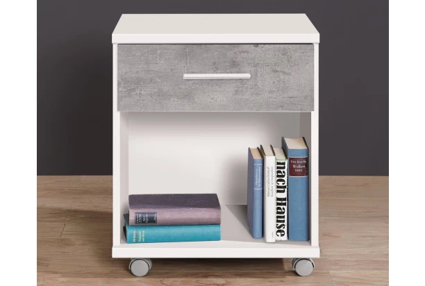 Úložný kontajner na kolieskach z programu Joker – univerzálny, moderný a hlavne praktický nábytok pre zariadenie izby pre deti, teenagerov i dospelých. V kombinácii biela/imitácia sivý betón.