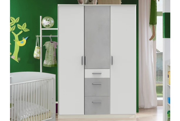 Šatníková skriňa so šírkou 135 cm z programu Joker – univerzálny, moderný a hlavne praktický nábytok pre zariadenie izby pre deti, teenagerov i dospelých. V kombinácii biela/imitácia šedý betón.