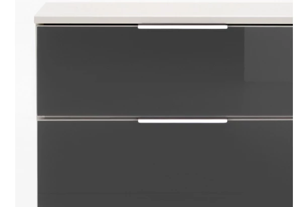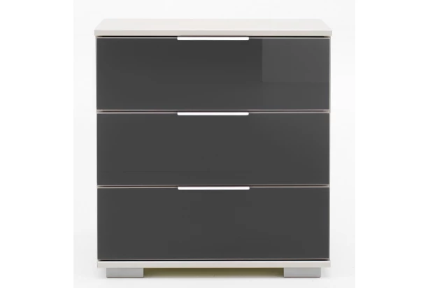 Vysoký nočný stolík z programu Easy plus ponúka 3 priestranné zásuvky nad sebou. V kombinácii bielej farby a šedého skla.