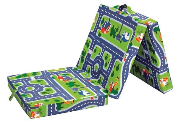 Skladací matrac pre príležitostné spanie návštev, by nemal chýbať v žiadnej domácnosti. Látkový zelený poťah s motívom autodráhy. Možno využiť aj ako doplnok do detskej izby na hranie.