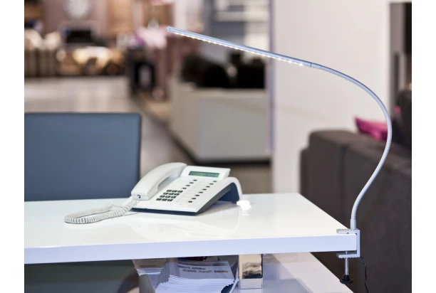 Moderná LED lampa s polohovateľným ramenom a svorkou, vďaka tomuto mechanizmu môžete lampu uchytiť k akémukoľvek nábytku.